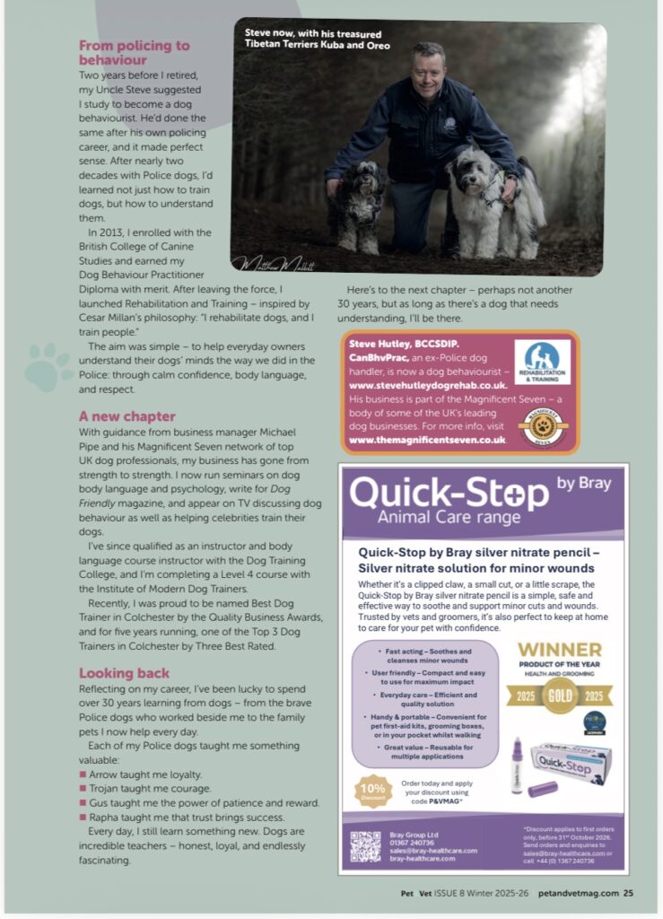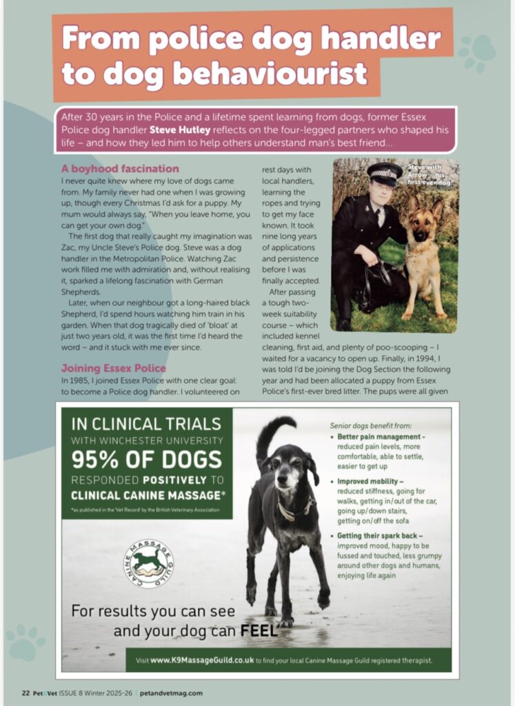 I was very honoured to be asked by Chris Ritchie the editor of ‘Pet & Vet’ Magazine to write an article for the magazine based on my life story from being a Police Dog Handler to becoming a Dog Behaviourist.