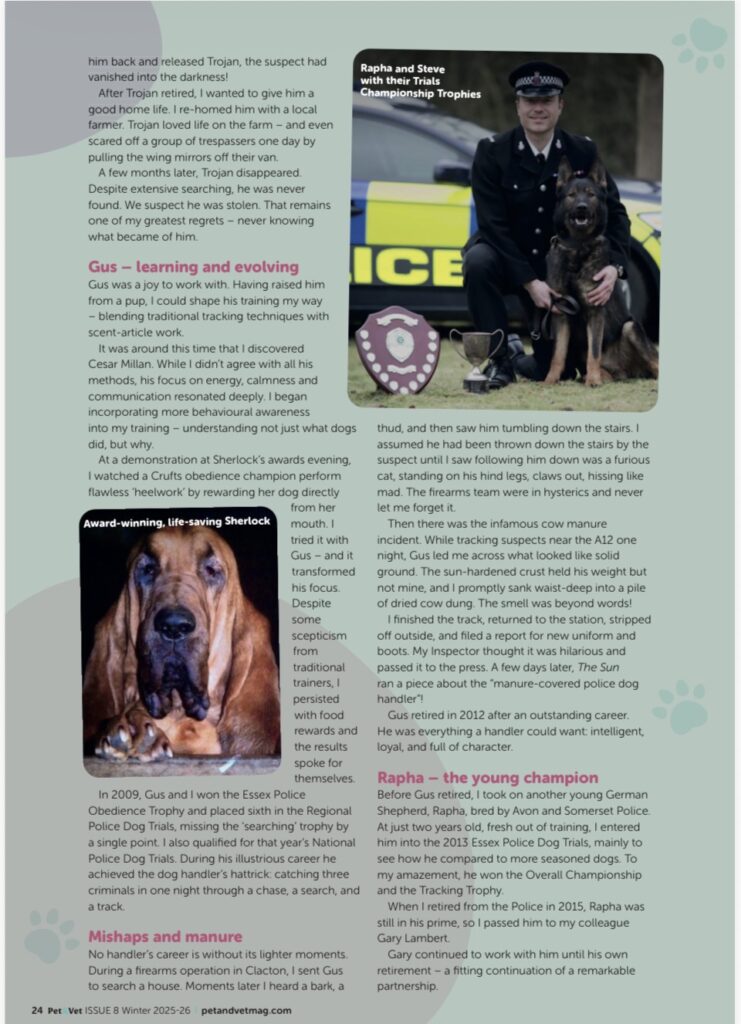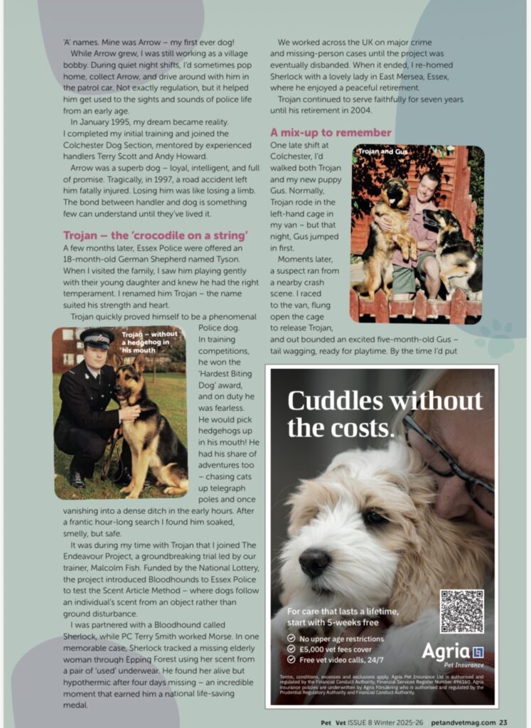 It was very therapeutic to put my life down in writing, how I started out loving dogs and reminiscing some of the work I had done with my wonderful Police dogs, some scary and some funny moments. A condensed version which appears in the magazine can be seen in the attached photo’s. http://www.petandvetmag.com