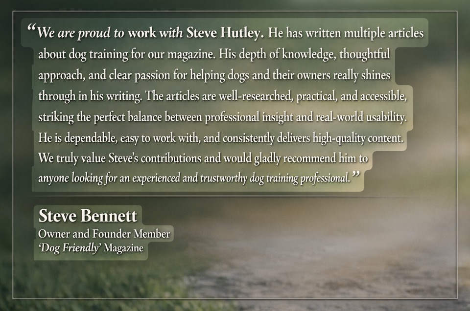 I am currently the Dog Behaviour Consultant for the national dog magazine ‘Dog Friendly’ , which is the UK only magazine dedicated to dog friendly places. Here I write a dog behavioural column for their bi-monthly magazine covering all aspects of dog training and behaviour related issues. http://www.dogfriendly.co.uk